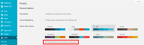 Aby wymusić na wszystkich użytkownikach schemat kolorów administratora, możesz użyć wtyczki Wymuś schemat kolorów administratora. Jest dość prosty w użyciu. Wystarczy zaznaczyć Wymuś ten schemat kolorów administratora na wszystkich użytkownikach opcja pod Schemat Kolorów Admina w Twoim Profil ustawienia.