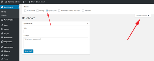 Przejdź do pulpitu WordPress, kliknij Opcje Ekranu zakładka w prawym górnym rogu strony. Wyświetli panel opcji zawierający pola wyboru, aby włączyć / wyłączyć widżety.