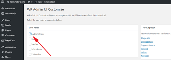 Będziemy używać darmowego interfejsu użytkownika WP Admin, aby to zrobić. Po zainstalowaniu i aktywacji wtyczki upewnij się, że ustawiłeś role użytkownika, dla których będziesz dostosowywał. Jeśli jest to na własny użytek, wybierz tylko Administrator rola. Jeśli jest to dla innych użytkowników, wybierz odpowiednie role.