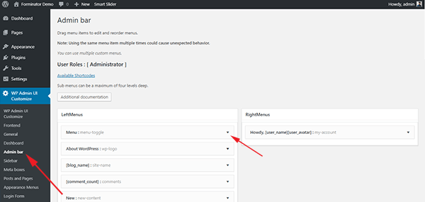 Następnie przejdź do WP Admin UI Dostosuj > pasek administratora aby zmodyfikować elementy menu paska administratora. Pasek administratora jest podzielony na sekcje lewą i prawą.