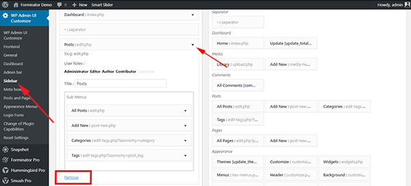 Podobnie, pasek boczny można modyfikować, przechodząc do WP Admin UI Dostosuj > pasek boczny. Interfejs i funkcjonalność są prawie takie same, z wyjątkiem tego, że nie musisz zajmować się dwiema różnymi sekcjami. Przeciągnij i upuść elementy menu tam, gdzie chcesz, lub usuń je całkowicie.